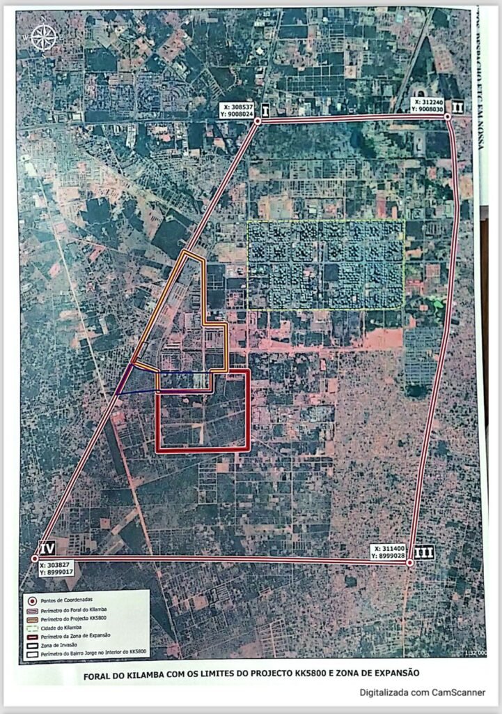 - Este croquis foi emitido em 2023, no perímetro definido em 2022 como reserva do Kilamba e inclui áreas do KK5800, com construções e sinalização da sua condição como pertença do Estado e numa altura em que já haviam recomeçado as obras, logo, só pode ser o resultado de uma associação criminosa.